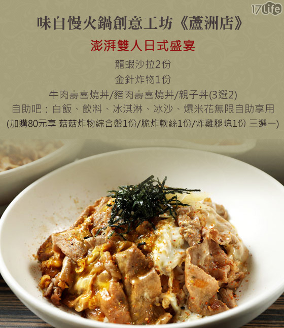 商品訊息簡述: 只要299元(雙人價)即可享用【味自慢火鍋創意工坊《蘆洲店》】原價576元澎湃雙人日式盛宴:龍蝦沙拉2份+金針炸物1份+牛肉壽喜燒丼/豬肉壽喜燒丼/親子丼(3選2)+白飯、飲料、冰淇淋、冰沙、爆米花無限自助享用。