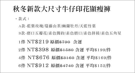 商品訊息簡述: 平均每件最低只要152元起(含運)即可購得秋冬新款大尺寸牛仔印花顯瘦褲1件/2件/4件/6件,皆有多種款式任選!